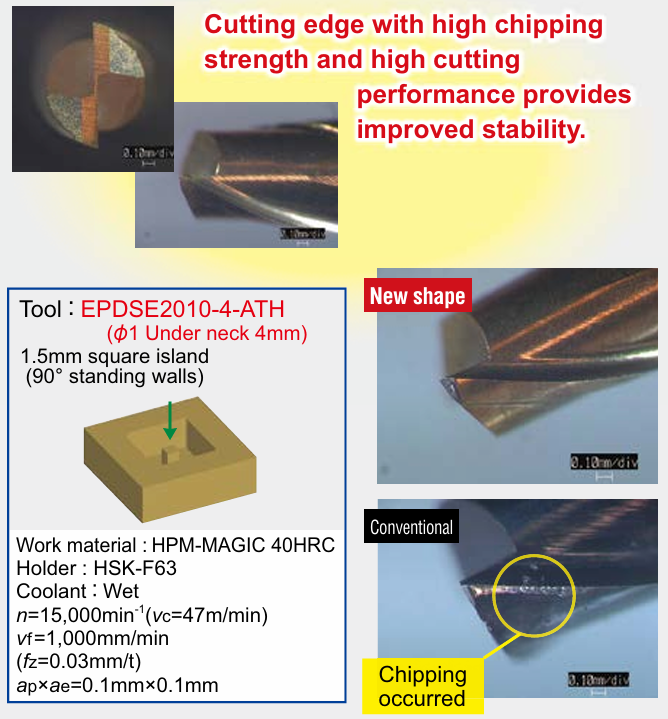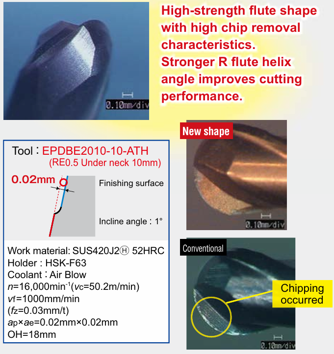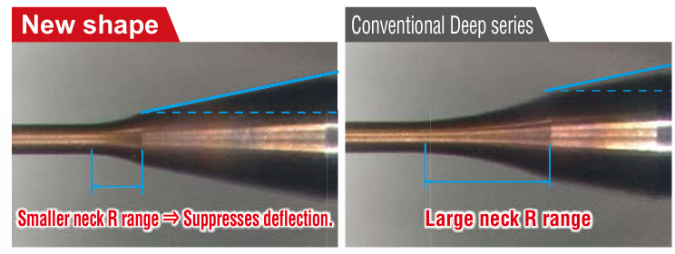 Further improves the conventional compound shape of R and taper to both resist breakage and suppress deflection. Caution |