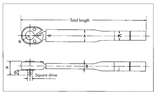 | Order No. (kgf•cm) | Range | Old Model (N•m) | Order No. (N•m) | Range | Order No. (lbf•in/ lbf•ft) | Range | Spanner sizes (W) | Total length | Dimensions (mm) |