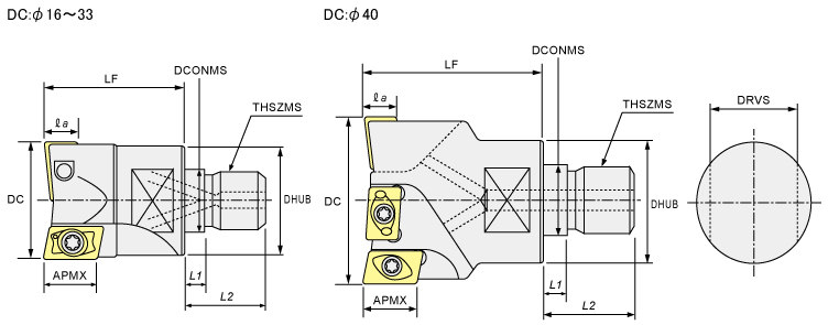 | DC | LF | ℓa | APMX | DCONMS | THSZMS | DHUB | L1 | L2 | DRVS | 底刃用 On end | 外周刃用 On periphery | |||||