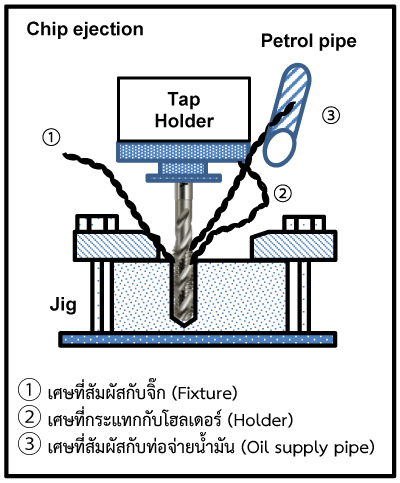 • หากเศษตัด (chips) ไปกระแทกกับ เครื่องจักร, จิ๊ก (fixture) หรือท่อ/สาย coolant เศษอาจไม่ถูกคายออกจากรูตามปกติ และเกิดการ พันติดอยู่กับเกลียวของต๊าปแทน • หากเส้นผ่านศูนย์กลางภายนอกของ Tap Holder ใหญ่เกินไป เศษตัด (chips) อาจไปชนกับตัวโฮลเดอร์ ทำให้เศษไม่สามารถคายออกได้ตามปกติ และเกิดการพันติดกับเกลียวของต๊าป • ปัญหาเศษตัดพัน (chip entanglement) สามารถทำให้เกิดได้ง่ายดังนี้ คมตัดบิ่น (cutting edge chipping) หรือการหักของต๊าปแบบรุนแรง (catastrophic breakage) • ควรตรวจสอบสภาพแวดล้อมการทำงาน เพื่อให้แน่ใจว่า เศษตัดสามารถคายออกได้อย่างราบรื่น