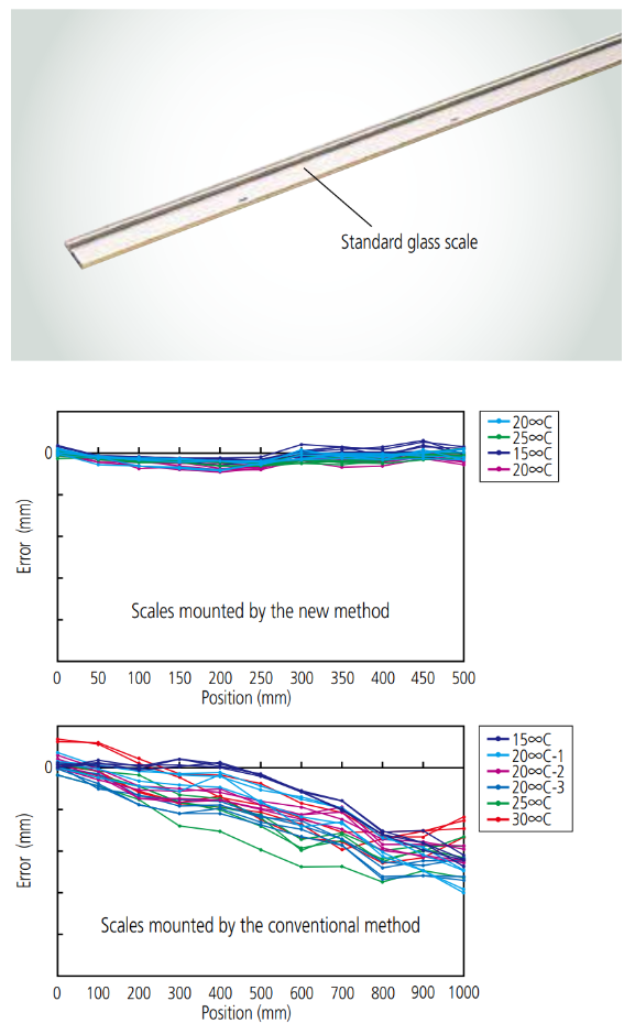 LEGEX ใช้สเกลแก้วตกผลึก ความละเอียด 0.01 µm มีค่าสัมประสิทธิ์การขยายตัวเชิงเส้นต่ำมาก (0.01×10⁻⁶/°C) ช่วยให้รักษาความแม่นยำได้แม้มีการเปลี่ยนแปลงอุณหภูมิ ยังมีวิธีติดตั้งแบบใหม่ที่ลดค่า Hysteresis ลงเหลือ 1/5 ของรุ่นก่อนหน้า