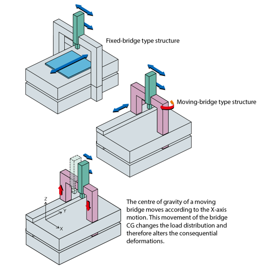 CMM ส่วนใหญ่ใช้แบบสะพานเคลื่อนที่ ที่มีชุดขับเคลื่อนอยู่ใต้เสาเพียงชุดเดียว ซึ่งมักทำให้เกิดการเอียงและการหมุนขณะเลื่อน