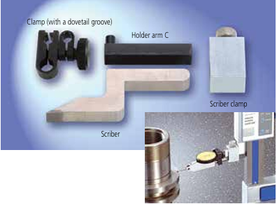 • Holder arm C which allows a test indicator to be attached to this gage and the clamp (with a dovetail groove) are available as optional accessories. (Refer to specifications.)