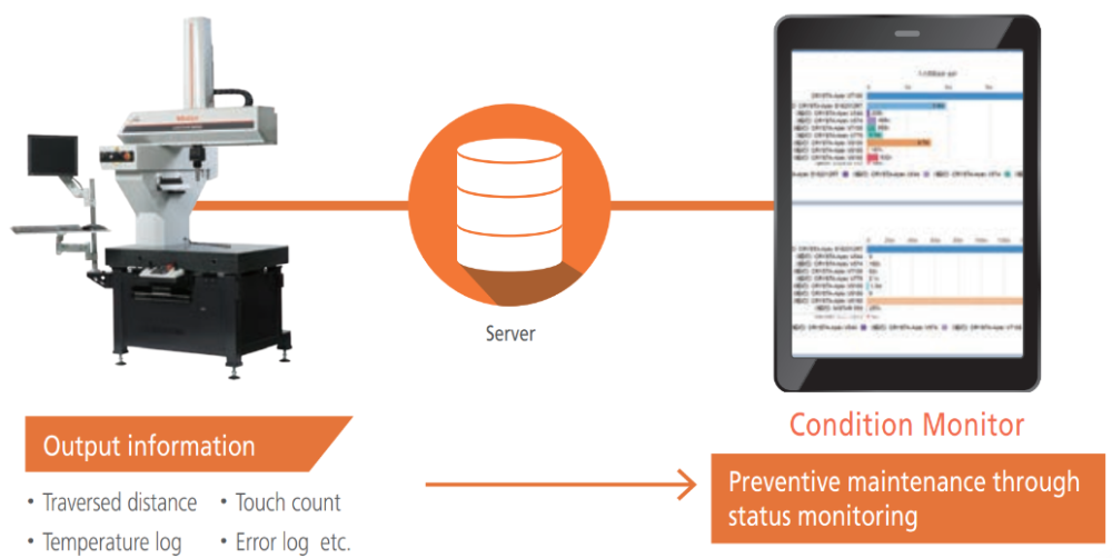 “Visualization of status” through constant collection and accumulation of coordinate measuring machine status information, such as the probe touch count and total distance traversed by each moving element along each axis, helps to prevent sudden machine stoppages that could have been avoided by timely maintenance. Status monitoring enables you to achieve a non-stop production facility