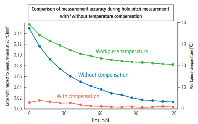The accuracy-guaranteed temperature range of 10 ºC to 40 ºC is achieved as a result of body architecture designed with temperature traceability in mind. The real-time workpiece temperature compensation makes temperature stabilization unnecessary, allowing for installation in a wider range of temperatures than conventional coordinate measuring machines