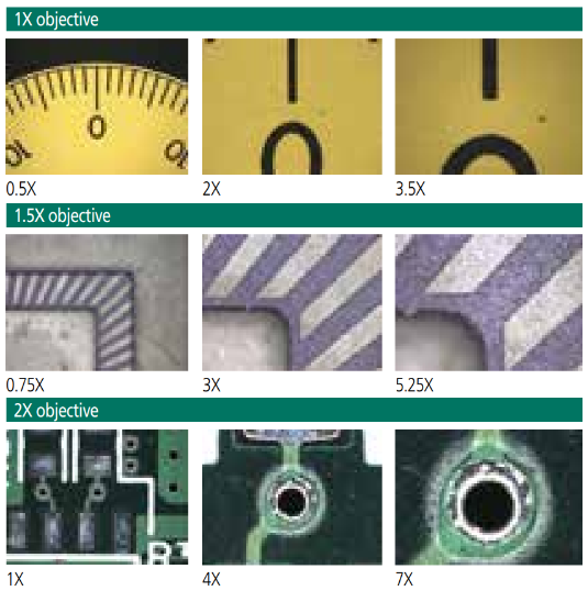 Interchangeable objective lens zoom unit The newly designed zoom unit and interchangeable objectives achieve a maximum magnification ratio of 14X. Viewing possibilities extend from low magnification wide view measurement to high magnification micro-measurement.