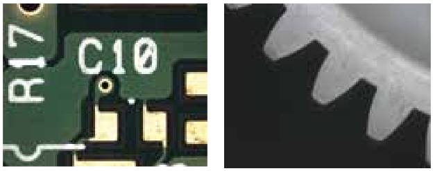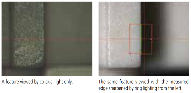 Matching lighting to the feature Transmitted, co-axial and 4-quadrant ring lighting is provided so that workpiece illumination can be set independently from the front, rear, right and left directions. This enables more reliable measurement by enhancing the sharpness of the edge of the feature to be measured.