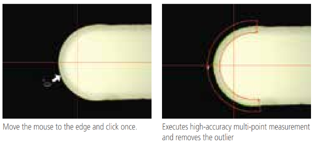 One-click tool After selecting the element to be measured (circle, line, etc.), just one click on an edge enables high-accuracy measurement regardless of the proficiency level of the operator. The outlier removal function automatically excludes bad data caused by burrs and dust