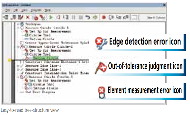 QVEasyEditor A teaching method is adopted in which programs are automatically recorded while measurement is performed. The insertion, revision, addition, and deletion of the part program can be performed easily using the tree-structure display. Also, execution of only a certain portion of the program after editing can be performed for the purpose of confirmation. Power-useroriented QVBasicEditor is also available as before.