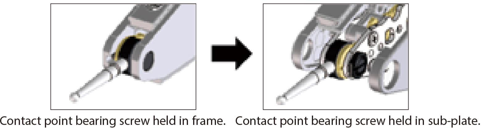 - The conventional method of mounting the contact point pivot bearing screw in the frame is prone to allowing looseness to develop with prolonged use. A unique sub-plate structure to house this screw has now been incorporated in all models and eliminates this issue.