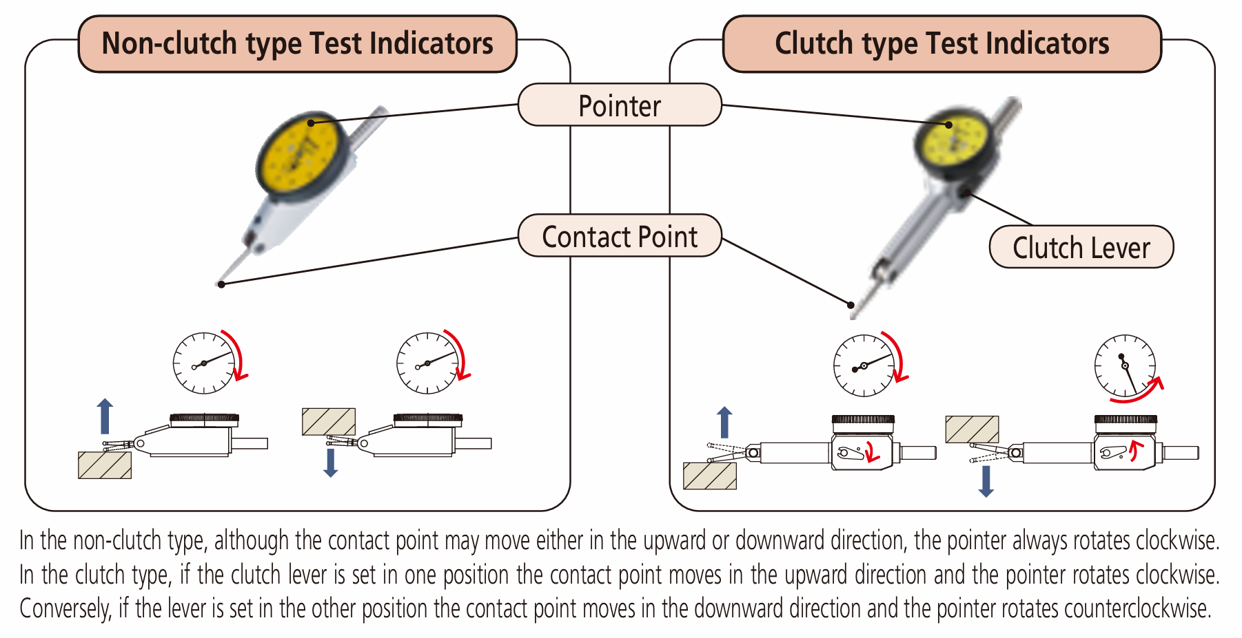 - There are two types of Mitutoyo Dial Test Indicator: The non-clutch type (without a clutch lever) and the clutch type (with a clutch lever)