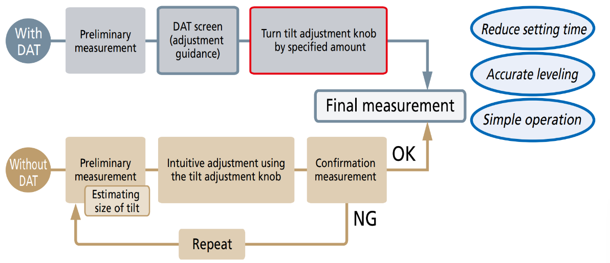The height/tilt adjustment unit comes as standard for leveling the drive unit prior to making skidless measurements and, supported by guidance from the unique DAT function, makes it easy to achieve highly accurate alignment.