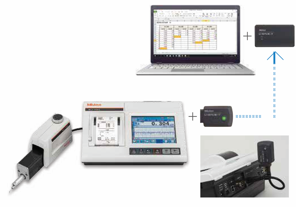 | This unit allows you to remotely load Surftest SJ-410 calculation results (SPC output) into commercial spreadsheet software on a PC. You can essentially use a one-touch operation to enter the calculation results (values) into the cells in the spreadsheet software. | This unit allows you to load Surftest SJ-410 calculation results (SPC output) into commercial spreadsheet software on a PC via a USB connector. You can essentially use a one-touch operation to enter the calculation results (values) into the cells in the spreadsheet software. | ||
