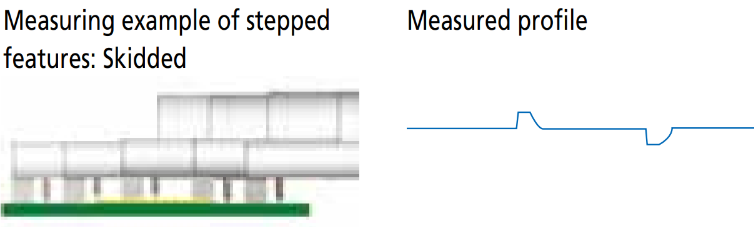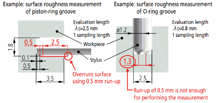 Surface roughness measurement requires a run-up distance before starting the measurement (or retrieving data). When the SJ-410 Series measures, its run-up distance is normally set to 0.5 mm. However, this distance can be shortened to 0.15 mm using the narrow-part measurement function. This function extends the measurement of narrow locations to features such as piston-ring grooves and O-ring grooves. Typical applications