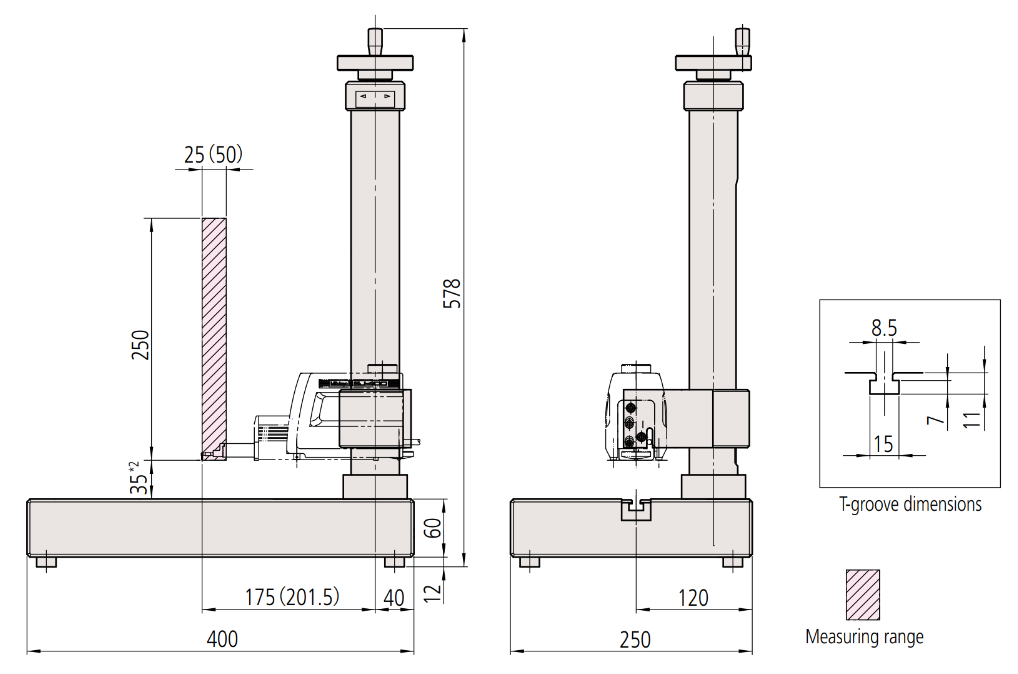 *2 This is the lowest position of the standard stylus mounted on the simple column stand. Since it is 35 mm from the base top, a block of suitable height is required for calibration with a roughness specimen. Use the stand in combination with optional accessories such as a leveling table (178-016) or an XY leveling table (178-024).