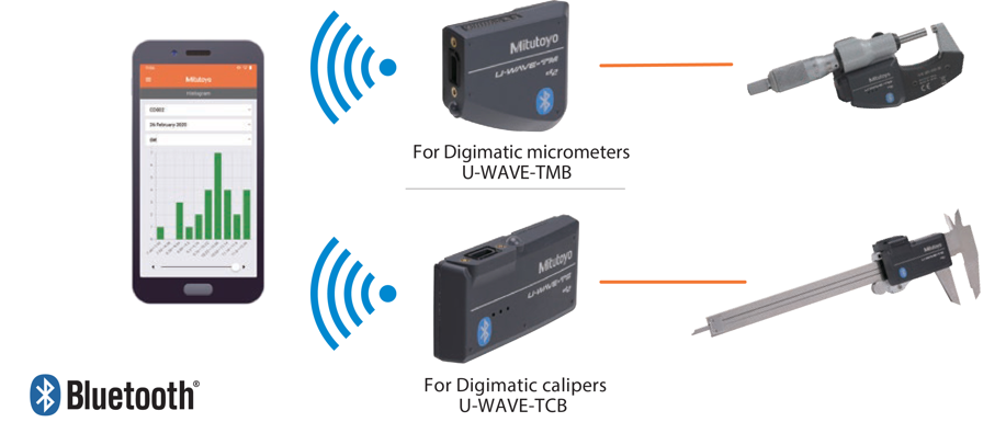 Mitutoyo Bluetooth® U-WAVE fit allows you to start measurements with your smartphone. |