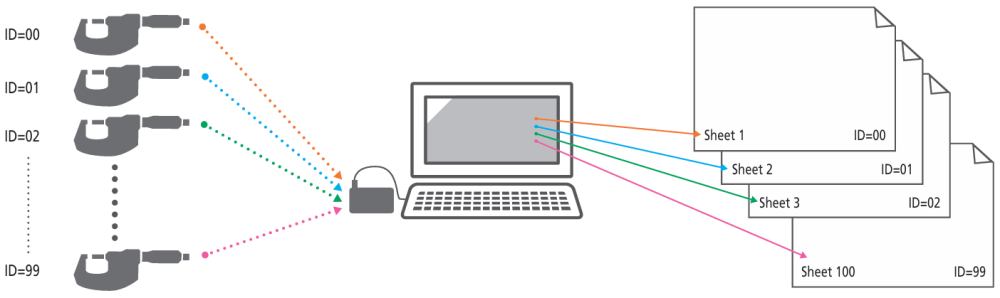 Up to 100 Digimatic gages can be registered 100 Digimatic gages at maximum can be registered to a receiver and the same number of Excel sheets can be designated. |
