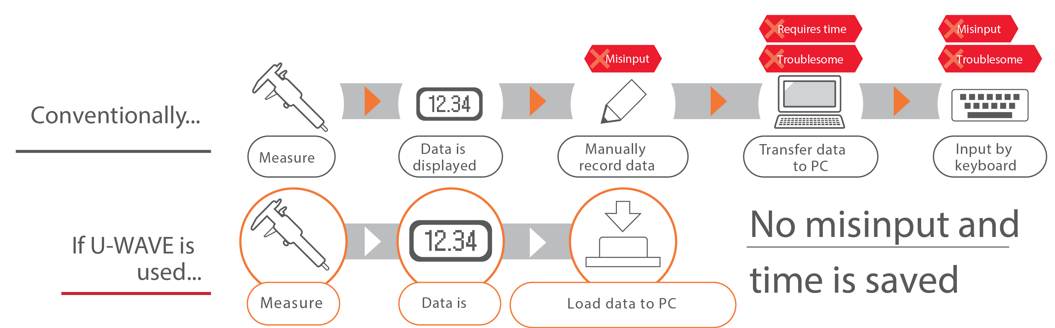 Solution U-WAVE immediately transmits the measurementdata to your PC. Misinput due to manual input can be eliminated, and therefore data reliability and operational efficiency is improved. |