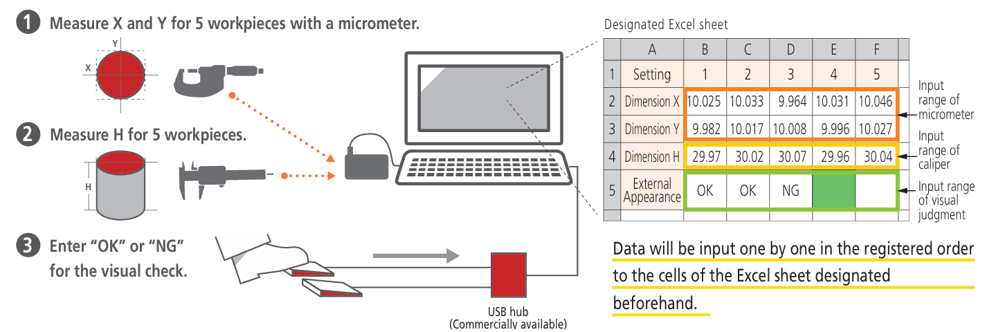 Input data of each Digimatic gage in order into the designated cells of the separate Excel sheet.