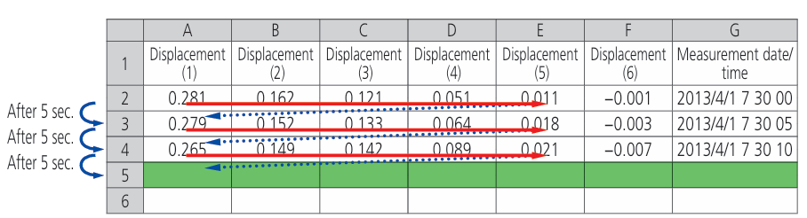 Issue | To measure displacement using multiple Digimatic gages and automatically obtain data in a certain input interval. |