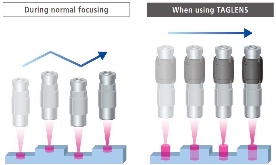 Until now, imaging of objects with differing heights and depths was performed by taking multiple photographs while moving the camera vertically (Z-axis motion). In contrast, TAGLENS allows simultaneous probing of multiple heights or depths. Moreover, a captured image is displayed in real time.