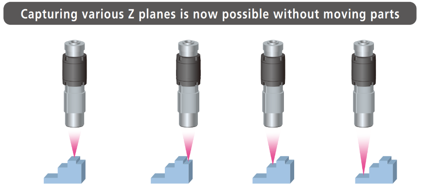 ・ A focused image in any specified Z-position can be captured without mechanical drive system within the observation range at an extended depth of focus.