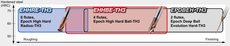 EHHBE-TH3 exhibits the performance during roughing to semi-finishing of high hardened steel (55HRC~).