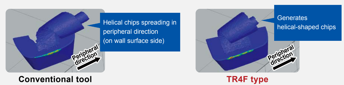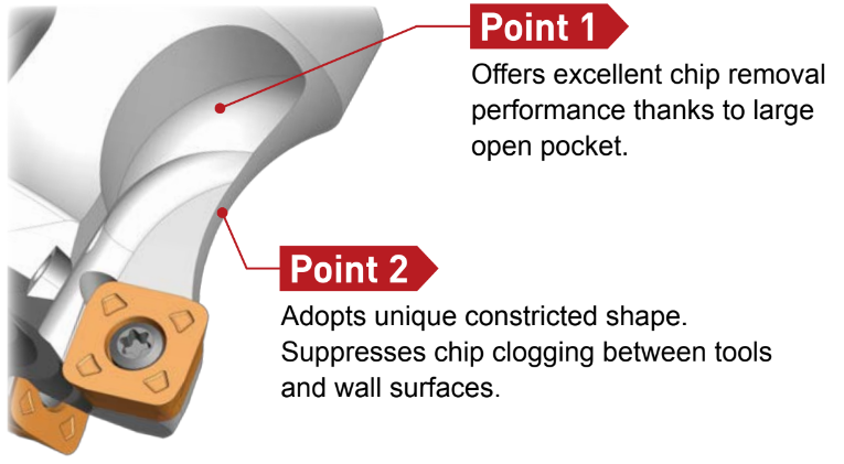 Prevents scraping due to chip breakage and bending, which often occurs during wall face machining, whether cutting up or down.