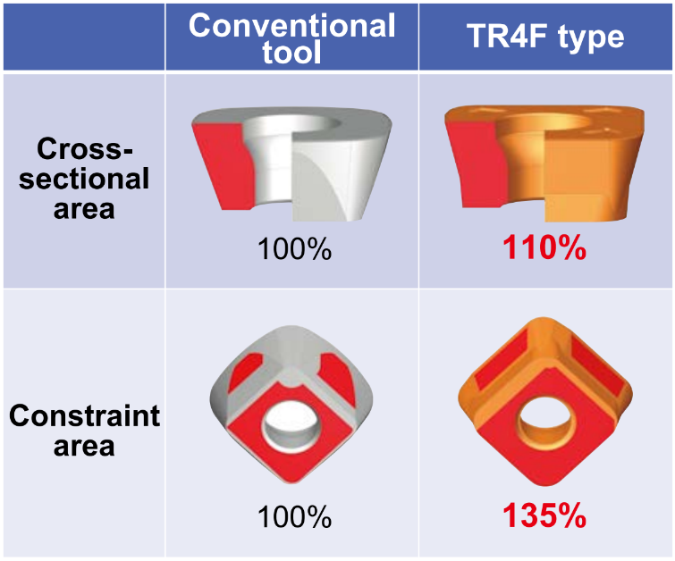 Secures insert strength and constraint force by enlarging cross-sectional and constraint areas even in high-load cutting. |