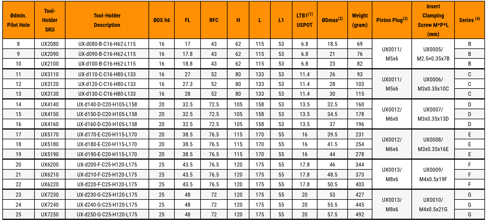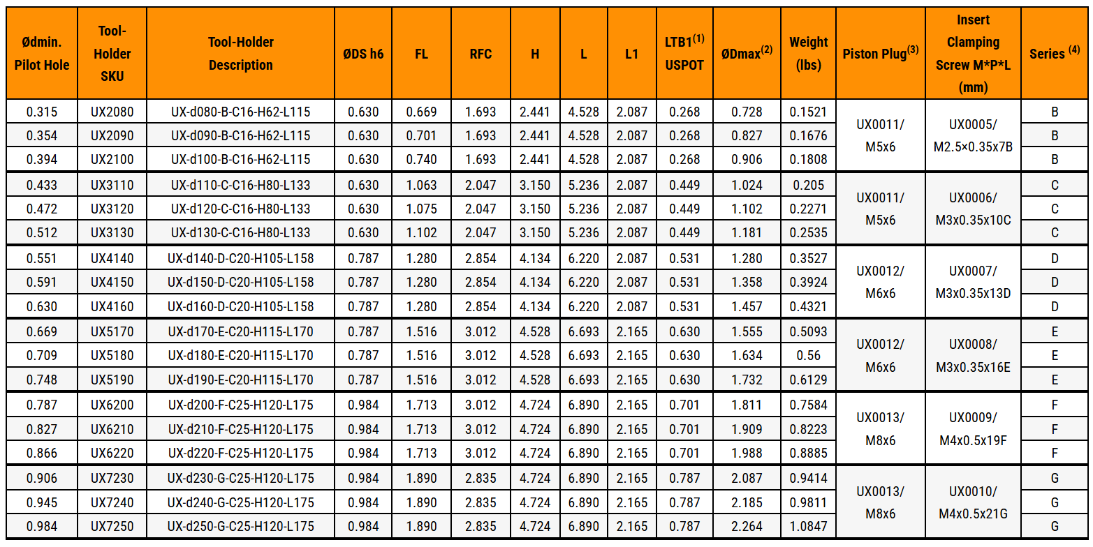 - มีขนาดให้เลือกหลากหลาย: ทูลโฮลเดอร์ UX มีขนาดเส้นผ่านศูนย์กลางตั้งแต่ Ø8 มม. ถึง Ø25 มม. (.315–.984 นิ้ว) พร้อมตัวเลือกมุมลบคมและขนาดสปอตเฟซที่หลากหลาย