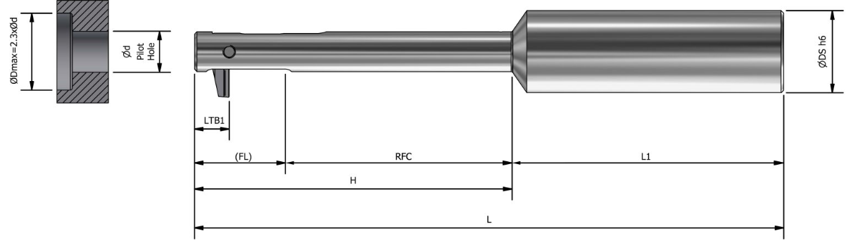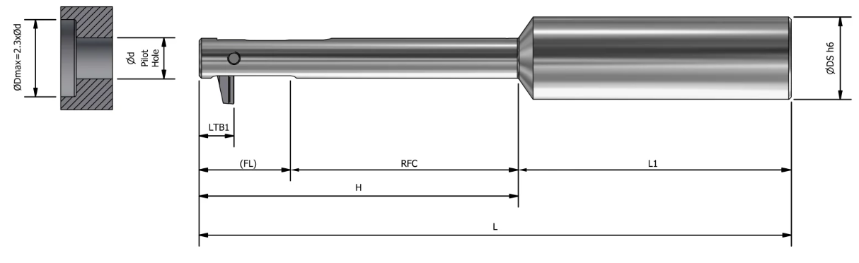 ตรวจสอบให้แน่ใจว่าความยาวรูนำ (L) มีค่าน้อยกว่าหรือเท่ากับค่า RFC (Relief For Cutting) โดยต้องเป็นไปตามเงื่อนไข L ≤ RFC ตามที่ระบุไว้ในตารางทูลโฮลเดอร์ UBACK ด้านล่าง