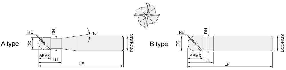 | Ball radius | Tool dia. | Flute length | Under neck length | Neck dia. | Overall length | Shank dia. | ||||