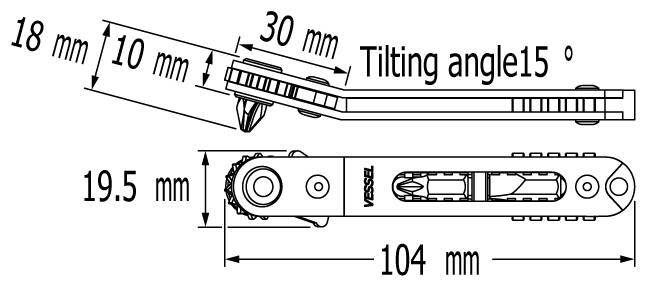 • Flat shaped ratchet screwdriver (bent-up type) • Bit Ph No.1, No.2, Slotted 6 x 18mm |