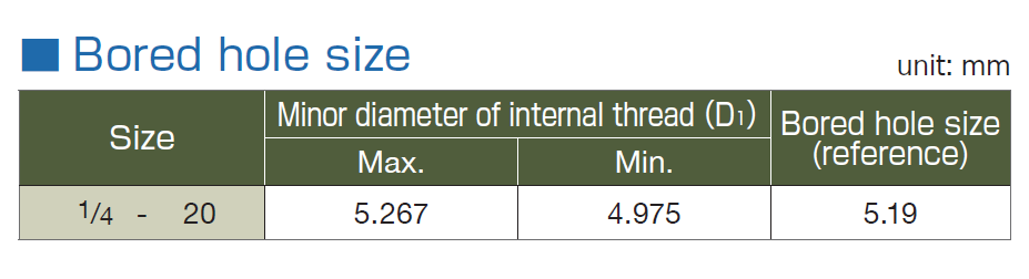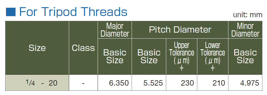 The tripod thread is larger by about 0.14 mm than the unified thread in terms of the pitch diameter tolerance of internal threads, while their thread shapes are the same.