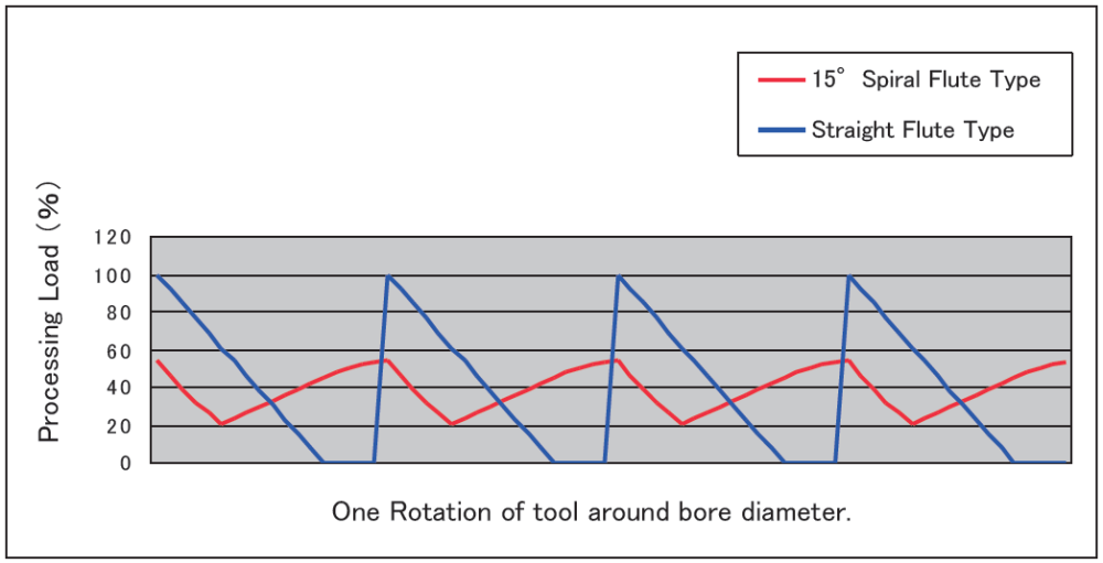 The graph on the upper right is a diagram of the machining torque change of a straight flute thread mill compared to a spiral flute