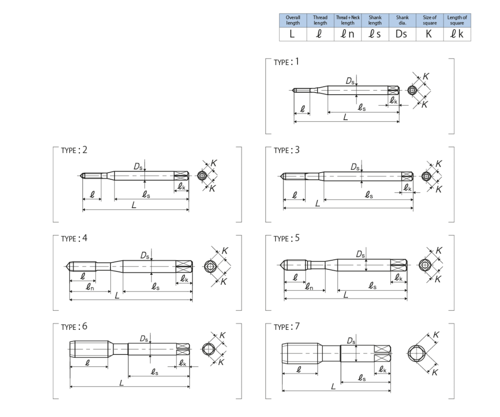 M5 to M6 taps with 2P chamfer have a center hole at the front end.