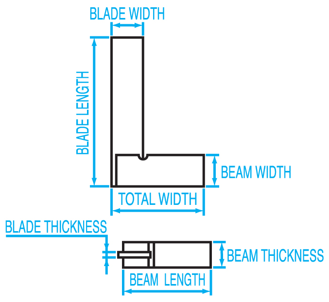 | Order No. | Model No. | Nominal Size (mm) | Blade Length (mm) | Blade Width (mm) | Blade Thickness (mm) | Base Length (mm) | Base Width (mm) | Base Thickness (mm) | Graduation Accuracy (±mm) | Squareness (±mm) | Weight |