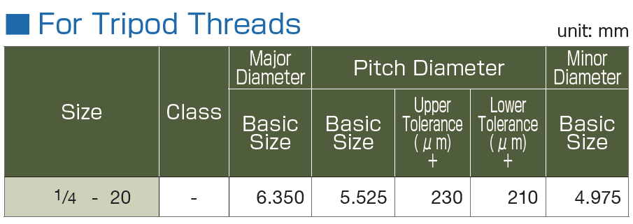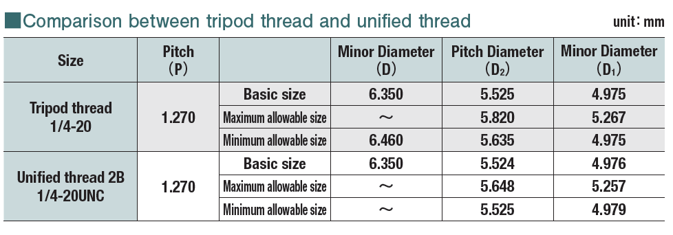 The tripod thread is larger by about 0.14 mm than the unified thread in terms of the accuracy of its pitch diameter of internal threads, while their thread shapes are the same.