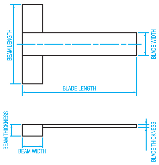 | Order Code | Model No. | Nominal Size (mm) | Blade Length (mm) | Blade Width (mm) | Blade Thickness (mm) | Beam Length (mm) | Beam Width (mm) | Beam Thickness (mm) | Squareness (±mm) | Weight |