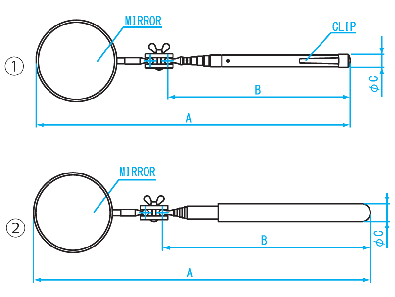 | Order No. | Model No. | Mirror Shape (mm) | A: Maximum Length(mm) | B: Telescope Length(mm) | C (mm) | Dimensions | Weight |